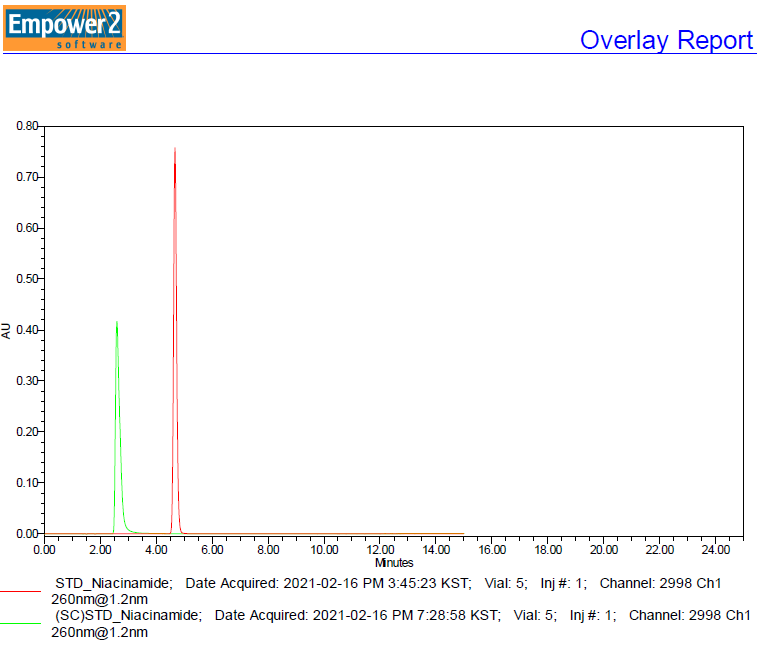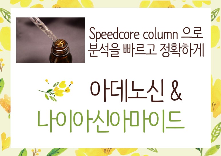 저는 SpeedCore Column과 일반 컬럼을 비교하기 위해 유엠씨 기업부설연구소에 Nicotinamide, Adenosine 분석 의뢰했습니다.